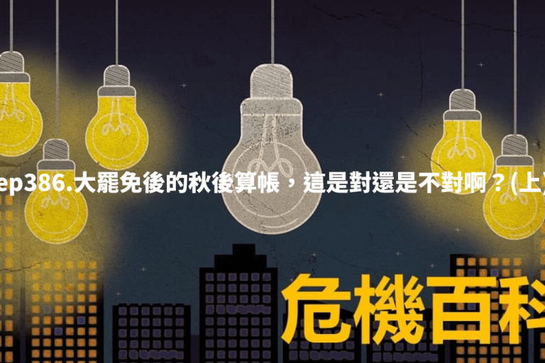 8 月252025 ep386.大罷免後的秋後算帳,這是對還是不對啊?(上) 影音專區, Podcast, 意外危機By Hans2025-08-25留言 歡迎收聽第386集的Podcast! 秋後算帳是對還是不對,這不是一個選擇題,這是一個心態及有人想要見縫插針的… 繼續閱讀