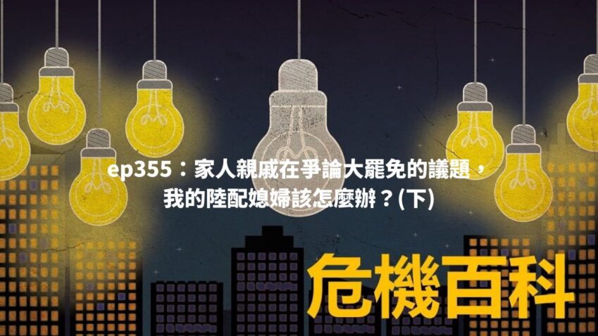 ep355.家人親戚在爭論大罷免的議題,我的陸配媳婦該怎麼辦?(下) 2025-04-21 歡迎收聽第355集的Podcast! 在知道婆媳溝通不順的原兇是兒子之後,那做婆婆的客戶要怎麼和陸配的媳婦就現… 繼續閱讀