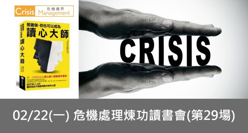 2/22危機處理煉功讀書會第29場:照著做,你也可以成為讀心大師(本活動匯款報名,限額20位,額滿截止) 2021-01-18 危機處理煉功讀書會第29場(本活動採匯款報名)活動時間:2021.2.22 晚上7~9:30報名截止日:本活動… 繼續閱讀