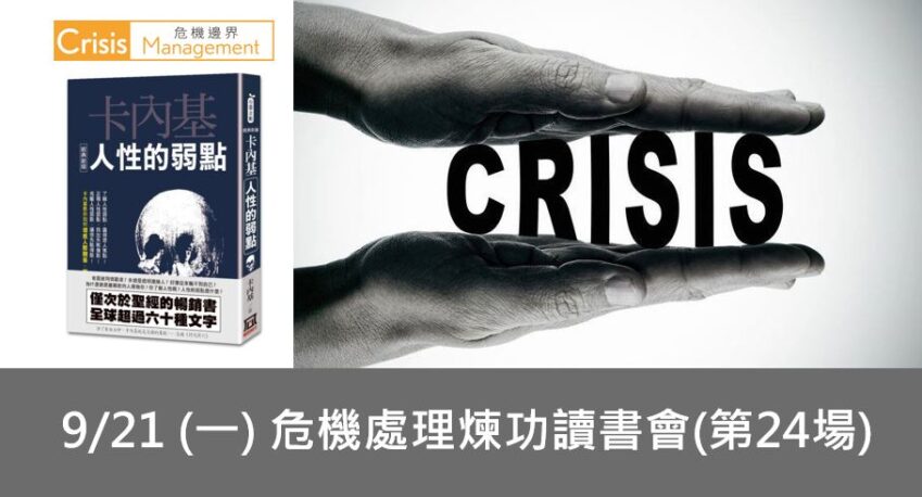 9/21危機處理煉功讀書會第24場:人性的弱點(本活動匯款報名,限額20位,額滿截止) 2020-09-07 危機處理煉功讀書會第24場(本活動採匯款報名)活動時間:2020.9.21 晚上7~9:30報名截止日:本活動… 繼續閱讀