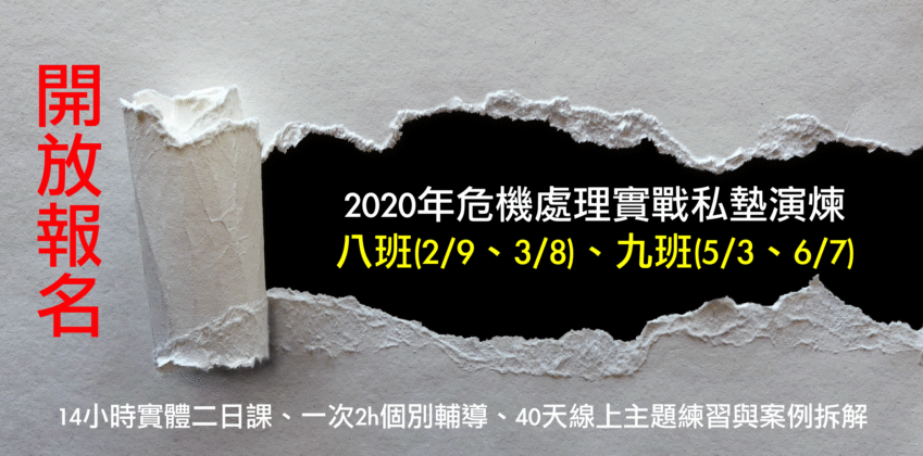 2020危機處理實戰私墊演煉八班(2/9、3/8)、九班(5/3、6/7)開放報名 2019-11-03 如果你人在中國的機場,錢包證件全部遺失,上不了飛機,進不了飯店,你這個時候要怎麼辦? 如果你的媽媽當著岳母的面… 繼續閱讀