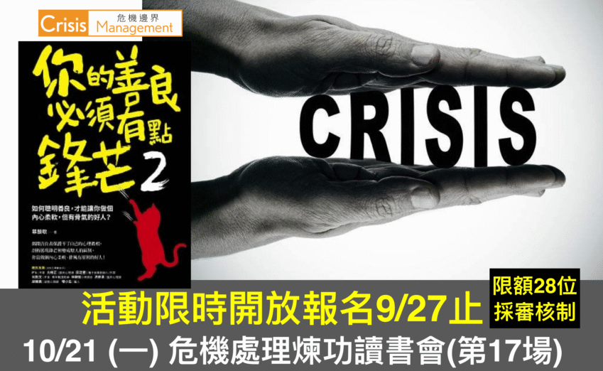 10/21危機處理煉功讀書會第17場:9/27截止報名,限額28位 本活動採審核制 2019-09-20 危機處理煉功讀書會第17場(本活動採審核制) 報名截止日:2019.927晚上12時 審核公告日:2019.9… 繼續閱讀